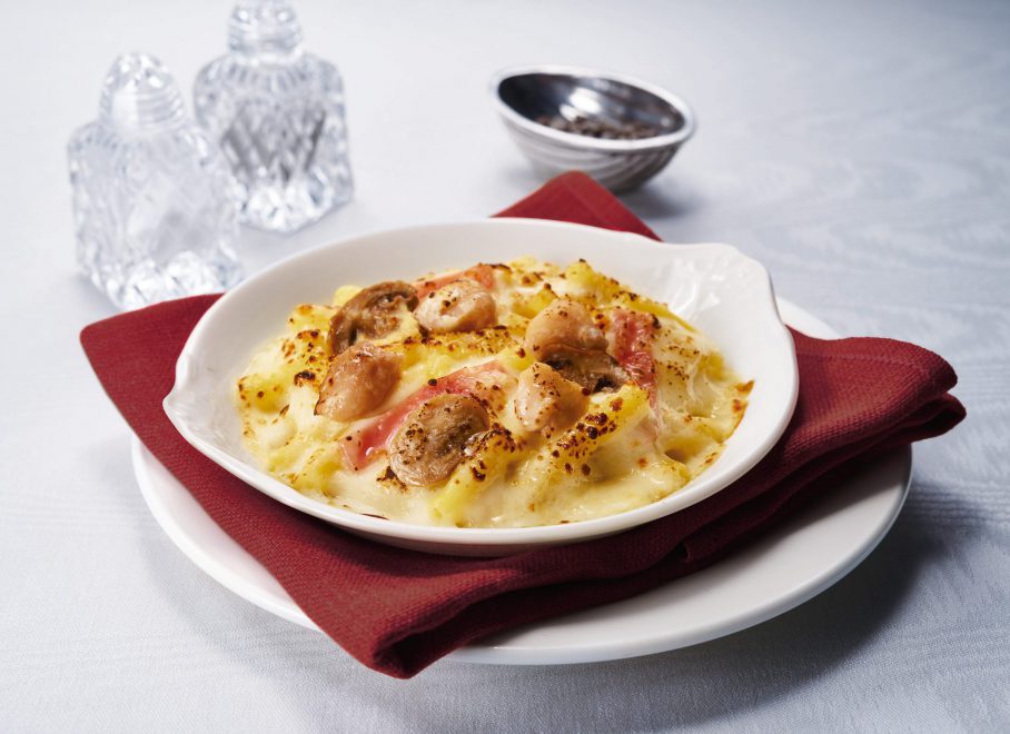 チキンの旨みを加えたクリーミーなホワイトソース。鶏肉とハムとマッシュルームが入ったマカロニグラタンです。