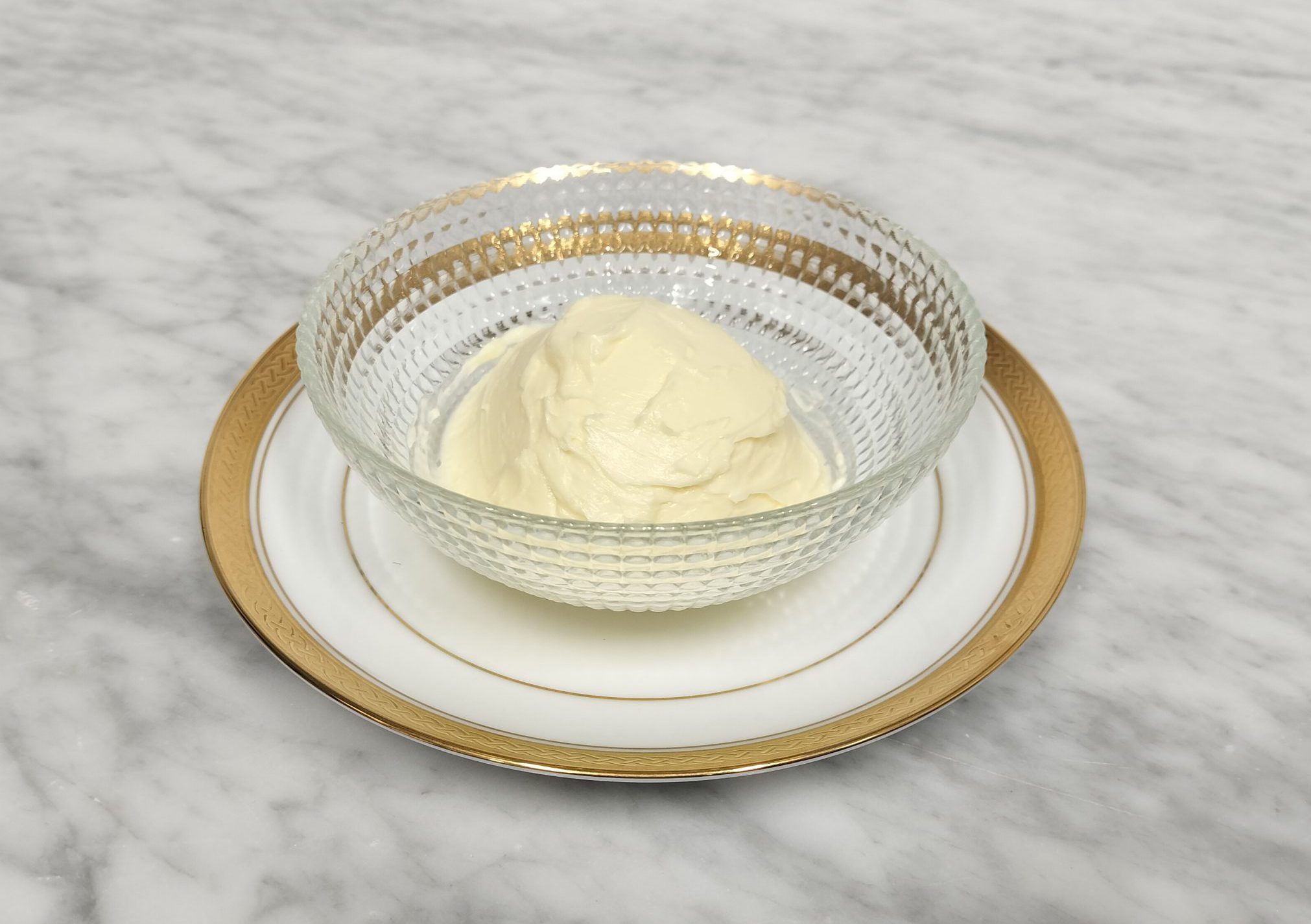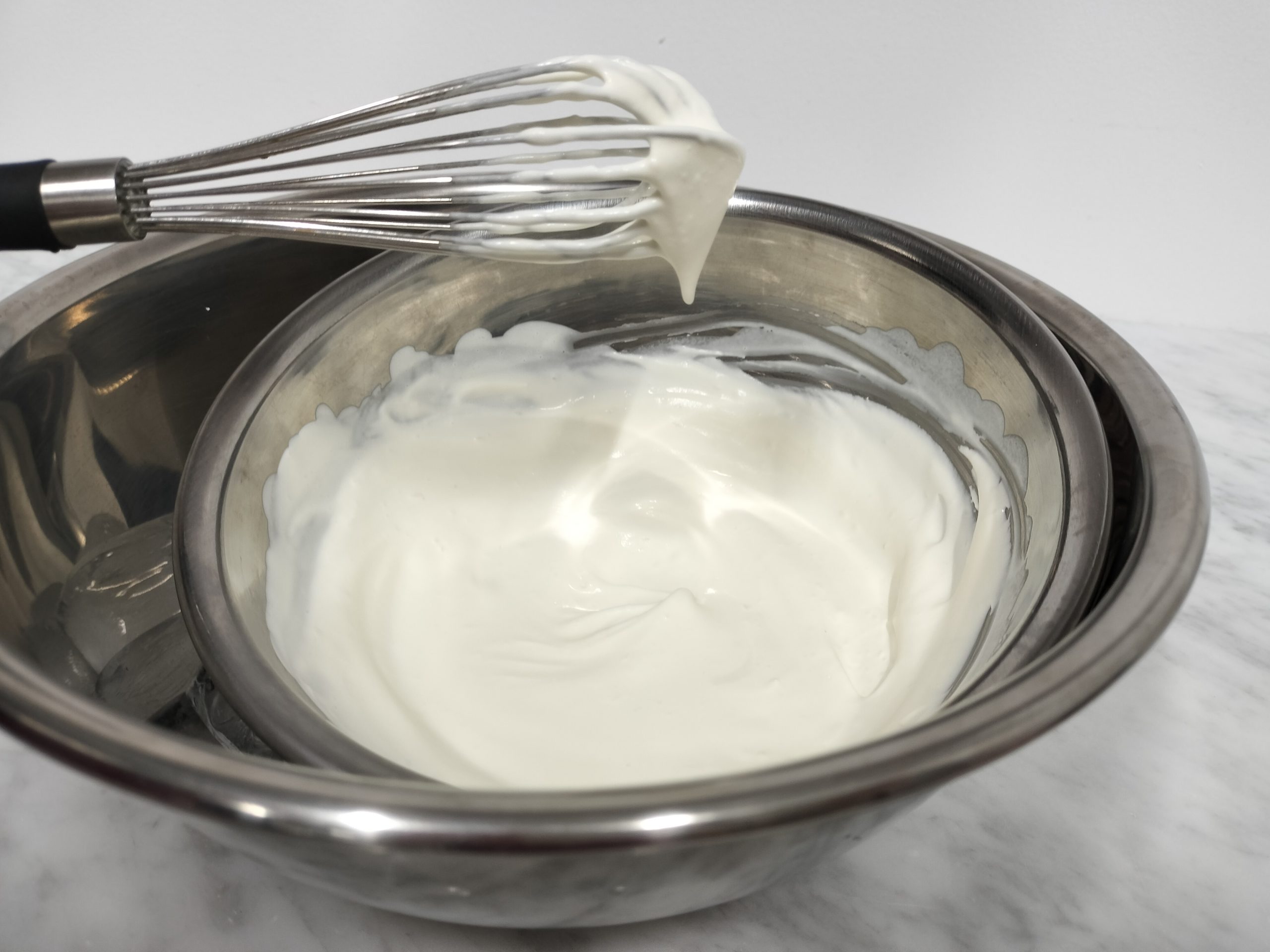 - 別のボールを氷水にあてて生クリーム(47%)を8分立てにします(スッとつのが立つくらい)